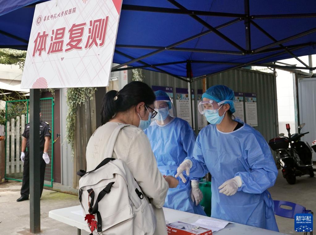 8月24日,在華東師范大學(xué)門口,參加演練的防疫人員對“體溫異常人員”進(jìn)行體溫復(fù)測和流調(diào)登記。 當(dāng)日,華東師范大學(xué)舉行2021年秋季學(xué)期開學(xué)疫情防控演練,以進(jìn)一步做好開學(xué)期間校園防疫工作。 新華社記者 劉穎 攝