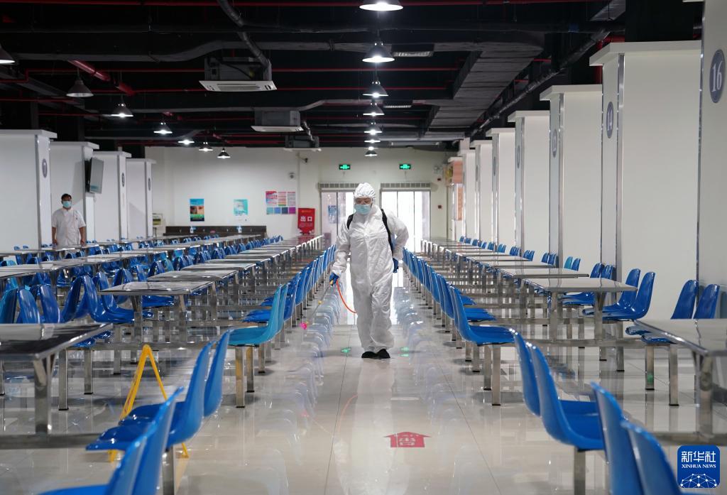 8月24日,在華東師范大學食堂,工作人員演示日常消殺。