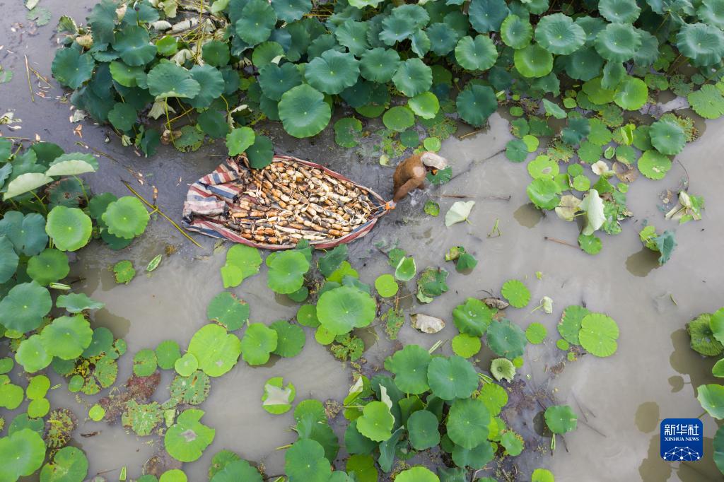 8月25日,東林鎮泉心村種植戶在荷塘里采收蓮藕(無人機照片)。新華社記者 徐昱 攝