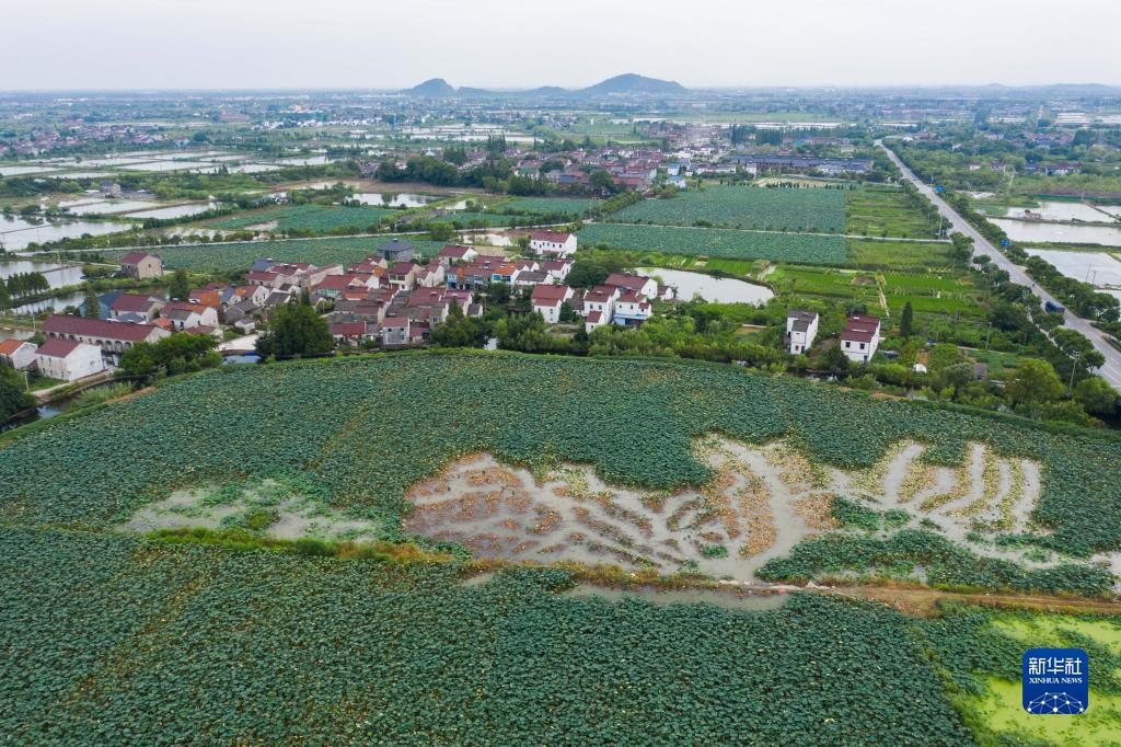 8月25日拍攝的東林鎮泉心村的荷塘(無人機照片)。近日,浙江省湖州市吳興區東林鎮的種植戶們迎來了收獲季節,蓮藕、菱角、茭白等水鄉特色農產品陸續進入收獲期,江南水鄉洋溢著豐收的喜悅。近年來,浙江省湖州市吳興區東林鎮以全域土地綜合整治為抓手,積極發展生態農業產業,培育了魚菜共生、稻蝦混養等一批新型生態產業模式,著力推動鄉村振興,實現共同富裕。新華社記者 徐昱 攝