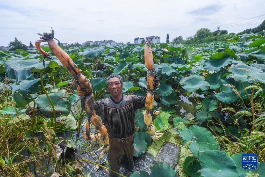 8月25日,東林鎮泉心村種植戶在荷塘里展示剛剛采收的蓮藕。新華社記者 徐昱 攝