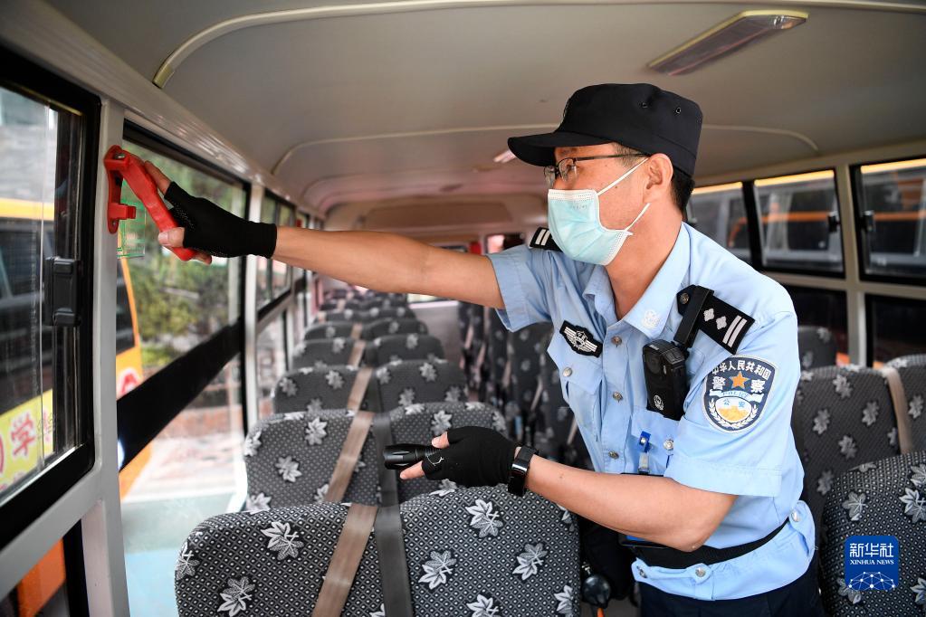 8月27日,銀川市車管所查驗民警在銀川市賀蘭縣西幼幼兒園對校車進行安全檢查。