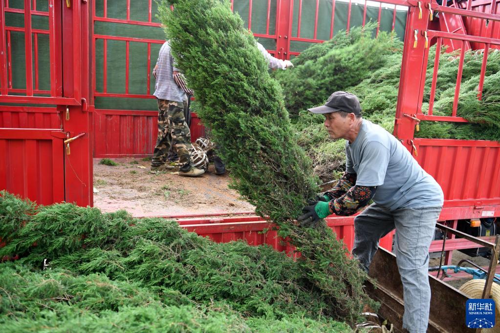 8月30日,來安縣舜山鎮林橋村村民在裝運銷售的苗木。