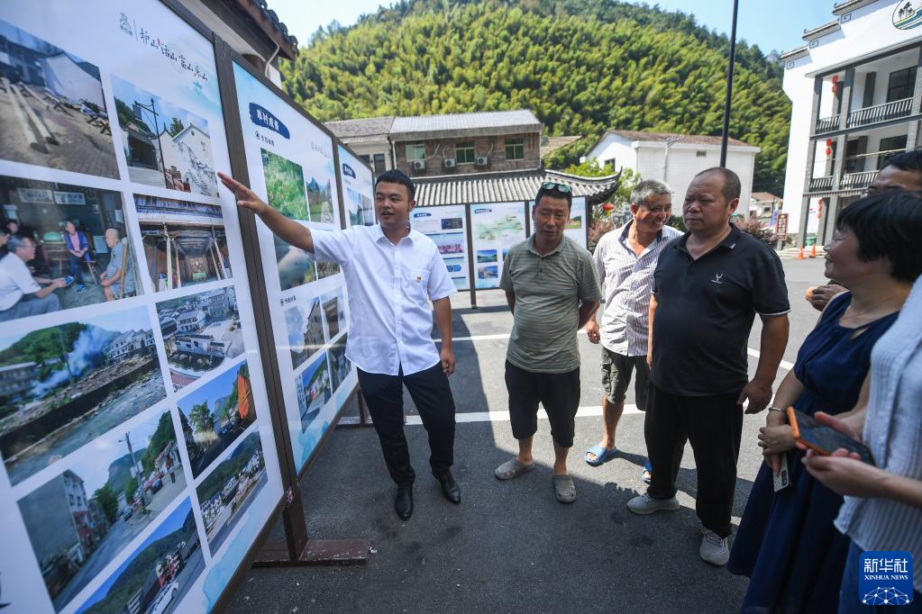 9月1日,杭州市臨安區高虹鎮的監察聯絡員(左一)在給石門村村民介紹村里的舊村改造工程。