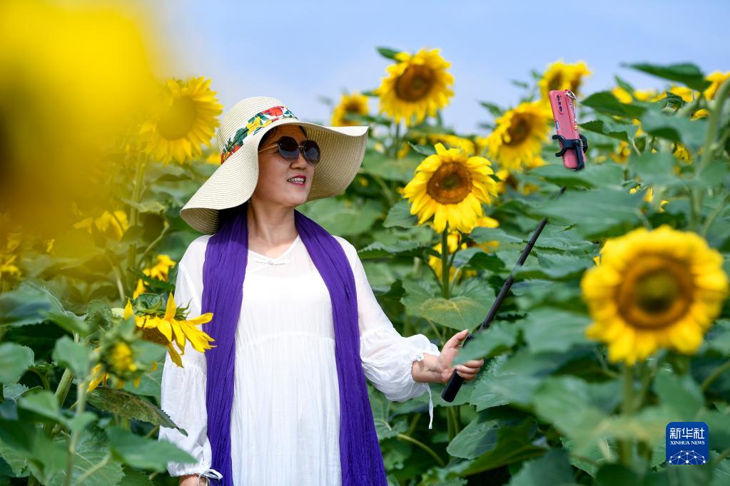 9月4日,游客在鎮(zhèn)北堡鎮(zhèn)德林村的向日葵花叢中自拍。