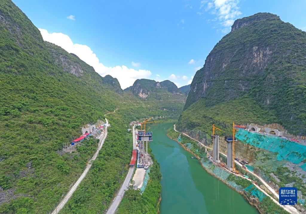 這是廣西都安瑤族自治縣龍灣鄉境內正在修建的賀巴(賀州至巴馬)高速公路跨越紅水河的橋梁(9月1日攝,無人機照片)。新華社記者 周華 攝