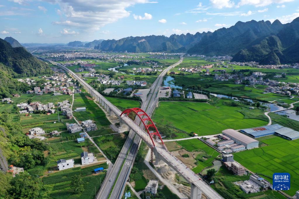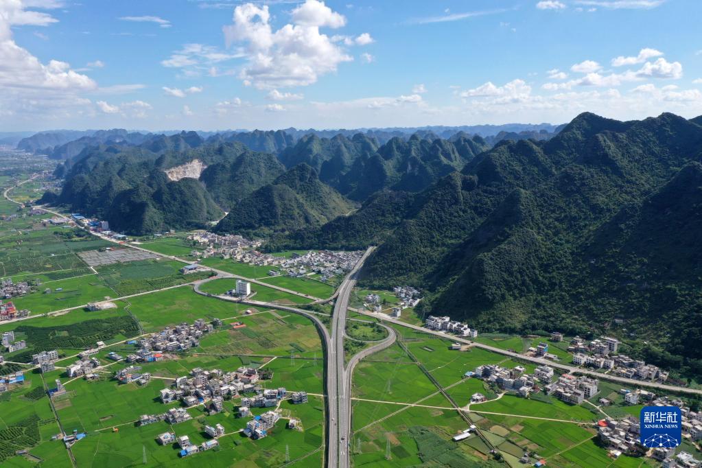 這是廣西都安瑤族自治縣高嶺鎮境內的高速公路、二級路和鄉村公路(8月31日攝,無人機照片)。新華社記者 陸波岸 攝