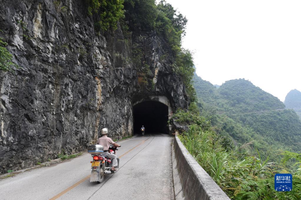 村民騎行穿越廣西都安瑤族自治縣澄江鎮境內的一處山區公路隧道(2015年7月2日攝)。新華社記者 陸波岸 攝 |