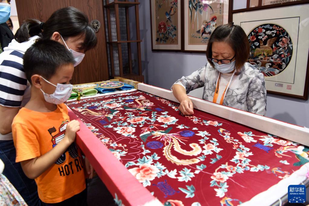 9月5日,觀眾在服貿會首鋼園區欣賞京繡傳承人王惠芳現場展示京繡傳統技藝。