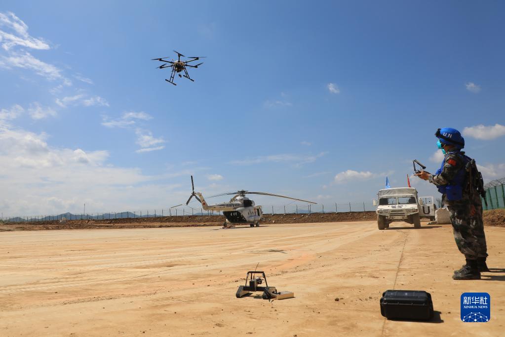 9月8日,在“共同命運-2021”國際維和實兵演習專業分訓中,參演官兵操作搜排爆無人機對臨時基地進行搜索。 新華社記者 劉芳 攝 |