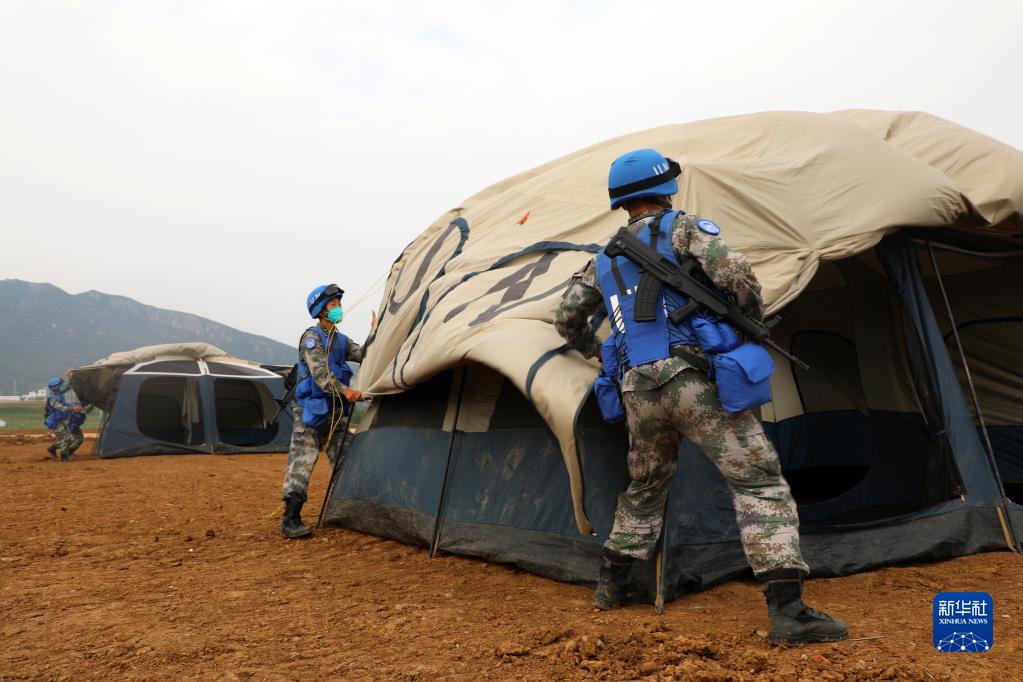 9月7日,在“共同命運-2021”國際維和實兵演習專業分訓中,參演官兵在臨時行動基地建設課目中搭建帳篷。 新華社記者 劉芳 攝