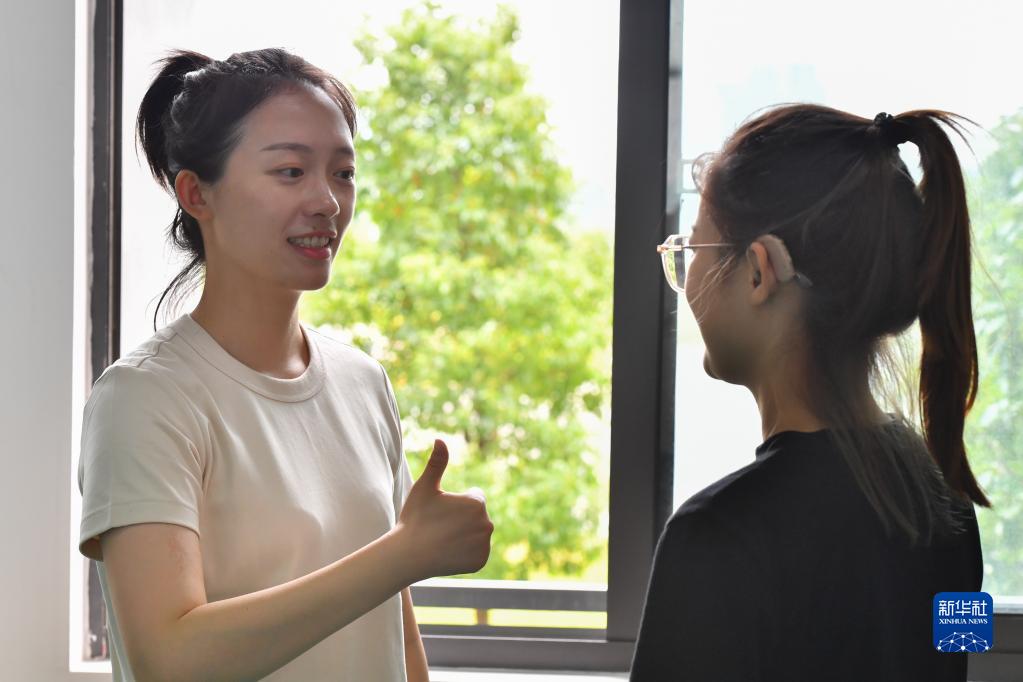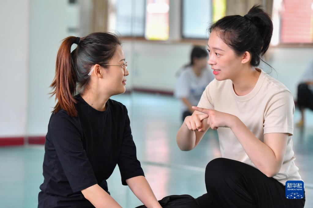 在長沙職業(yè)技術(shù)學(xué)院特殊教育學(xué)院,鄧蕓虹(右)在溫習(xí)手語表達(9月7日攝)。 鄧蕓虹2014年畢業(yè)于浙江師范大學(xué)舞蹈專業(yè),同年進入長沙職業(yè)技術(shù)學(xué)院后擔(dān)任特殊教育學(xué)院專職輔導(dǎo)員和舞蹈社團指導(dǎo)教師。一次舞蹈課后,鄧蕓虹收到了來自聽障學(xué)生的一條短信:“鄧老師,您好!我能跟您學(xué)跳舞嗎?”鄧蕓虹發(fā)現(xiàn),學(xué)校有很多想要學(xué)習(xí)跳舞的聽障學(xué)生,借著這個契機,她組建了聽障大學(xué)生舞蹈社團。 為了讓自己迅速融入學(xué)生們的“無聲世界”,鄧蕓虹利用業(yè)余時間學(xué)習(xí)手語,同時研究教法、編創(chuàng)舞蹈作品、訓(xùn)練指揮團隊……她發(fā)現(xiàn),學(xué)生雖然聽不到聲音,但感知力和模仿能力很強。在課堂上,她會根據(jù)經(jīng)驗設(shè)計動作、表情和眼神,讓學(xué)生充分理解音樂傳遞的情感。 “我當(dāng)他們的耳朵,我就是他們的音樂。”鄧蕓虹說,為了學(xué)習(xí)舞蹈,聽障學(xué)生比常人要多付出十幾倍的努力,通過學(xué)習(xí)舞蹈,他們也變得開朗自信,幫助學(xué)生圓“舞蹈夢”的使命將激勵她一直堅持下去。 新華社記者 陳澤國 攝