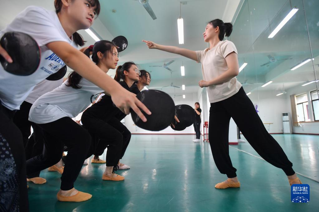 在長沙職業(yè)技術(shù)學(xué)院特殊教育學(xué)院的舞蹈房里,鄧蕓虹通過擊鼓幫助學(xué)生感受節(jié)奏(9月7日攝)。 鄧蕓虹2014年畢業(yè)于浙江師范大學(xué)舞蹈專業(yè),同年進入長沙職業(yè)技術(shù)學(xué)院后擔(dān)任特殊教育學(xué)院專職輔導(dǎo)員和舞蹈社團指導(dǎo)教師。一次舞蹈課后,鄧蕓虹收到了來自聽障學(xué)生的一條短信:“鄧老師,您好!我能跟您學(xué)跳舞嗎?”鄧蕓虹發(fā)現(xiàn),學(xué)校有很多想要學(xué)習(xí)跳舞的聽障學(xué)生,借著這個契機,她組建了聽障大學(xué)生舞蹈社團。 為了讓自己迅速融入學(xué)生們的“無聲世界”,鄧蕓虹利用業(yè)余時間學(xué)習(xí)手語,同時研究教法、編創(chuàng)舞蹈作品、訓(xùn)練指揮團隊……她發(fā)現(xiàn),學(xué)生雖然聽不到聲音,但感知力和模仿能力很強。在課堂上,她會根據(jù)經(jīng)驗設(shè)計動作、表情和眼神,讓學(xué)生充分理解音樂傳遞的情感。 “我當(dāng)他們的耳朵,我就是他們的音樂。”鄧蕓虹說,為了學(xué)習(xí)舞蹈,聽障學(xué)生比常人要多付出十幾倍的努力,通過學(xué)習(xí)舞蹈,他們也變得開朗自信,幫助學(xué)生圓“舞蹈夢”的使命將激勵她一直堅持下去。 新華社記者 陳澤國 攝