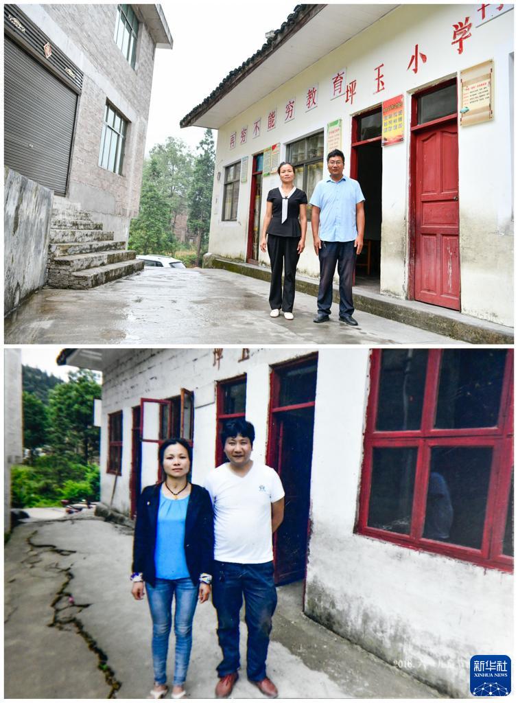 拼版照片:上圖為2021年9月7日,潘仲勇、朱木群夫婦在坪玉教學點前的留影;下圖為2016年6月1日,潘仲勇、朱木群夫婦在坪玉教學點前的留影(翻拍照片)。新華社記者 楊文斌 攝