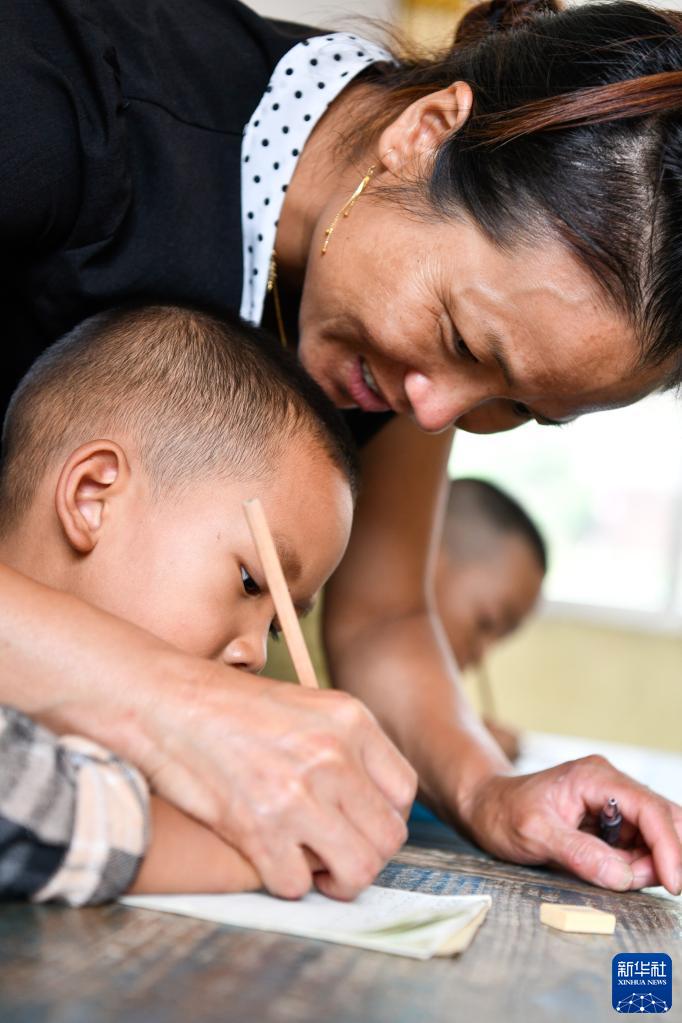9月7日,在貴州省鎮(zhèn)遠縣報京鄉(xiāng)松柏村坪玉教學點,朱木群在指導學前班孩子學寫字。新華社記者 楊文斌 攝