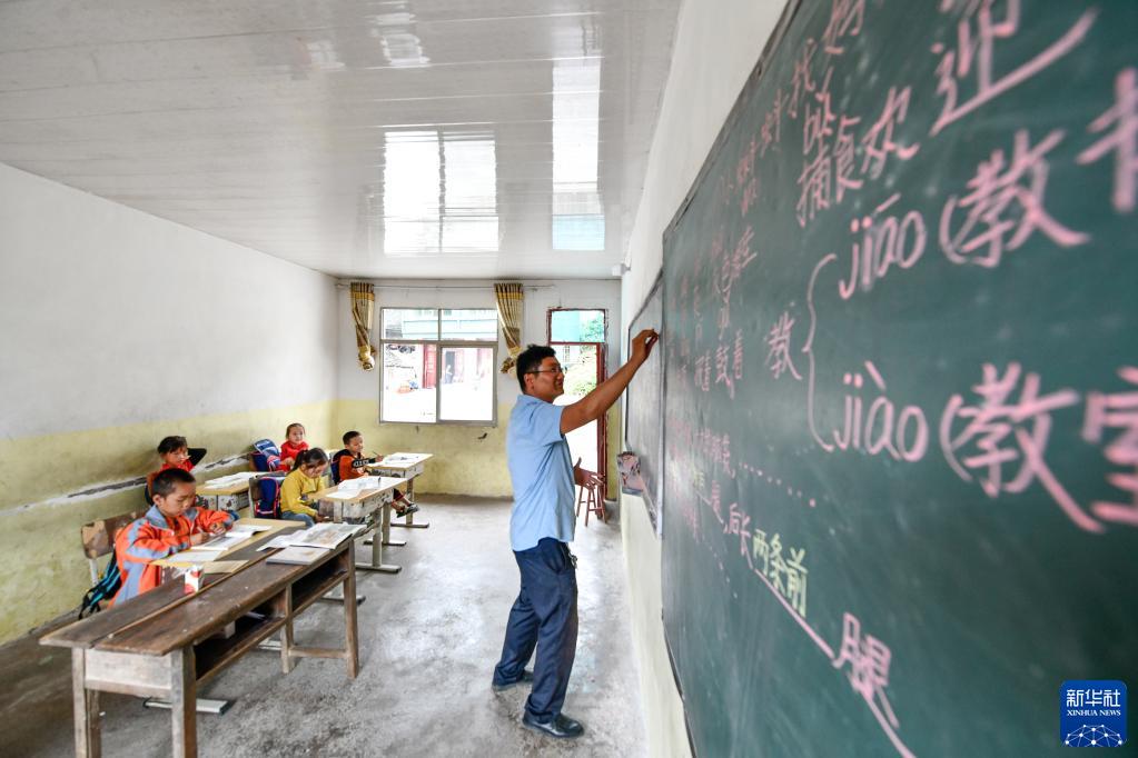 9月7日,在貴州省鎮(zhèn)遠縣報京鄉(xiāng)松柏村坪玉教學點,教師潘仲勇給學生上課。新華社記者 楊文斌 攝 |