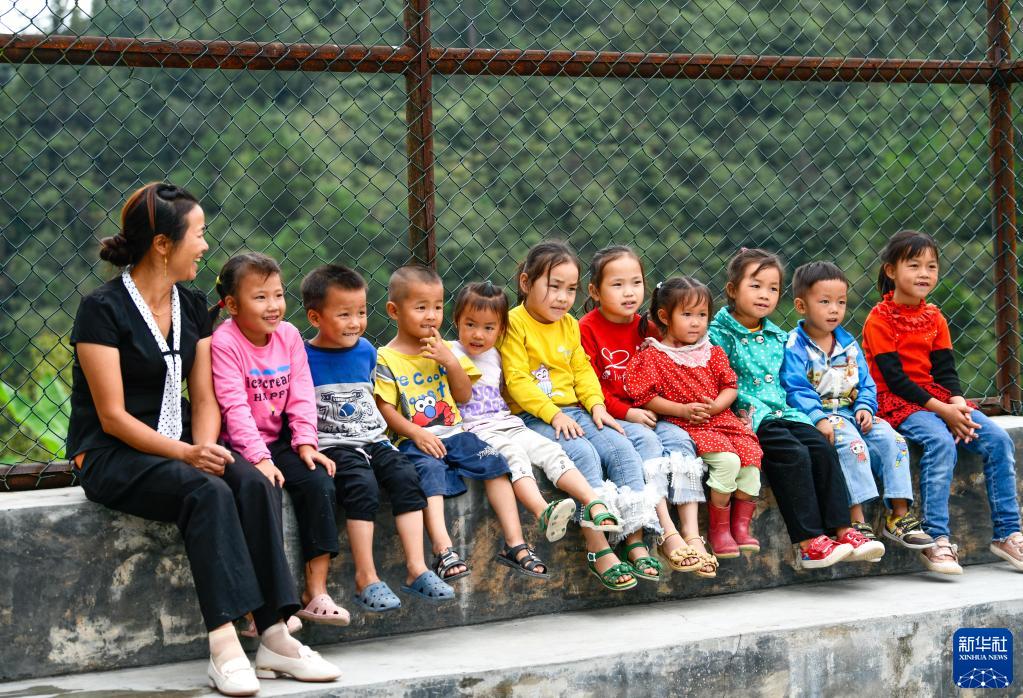 9月7日,在貴州省鎮(zhèn)遠縣報京鄉(xiāng)松柏村坪玉教學點,朱木群(左二)組織孩子們排隊放學。新華社記者 楊文斌 攝