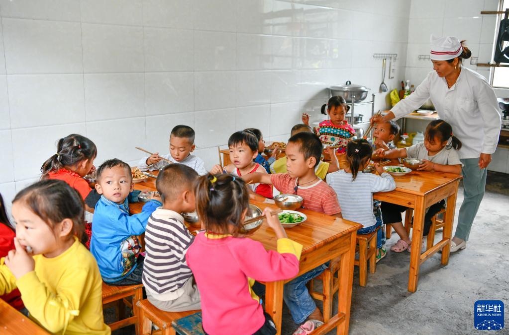 9月8日,在貴州省鎮遠縣報京鄉松柏村坪玉教學點,朱木群照顧孩子們吃營養餐。新華社記者 楊文斌 攝