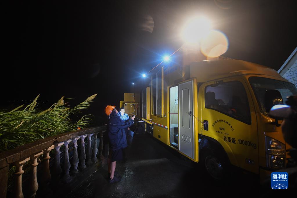 9月12日,在浙江省舟山市朱家尖街道的連心海塘,搶險人員用排水車進行排水搶險。