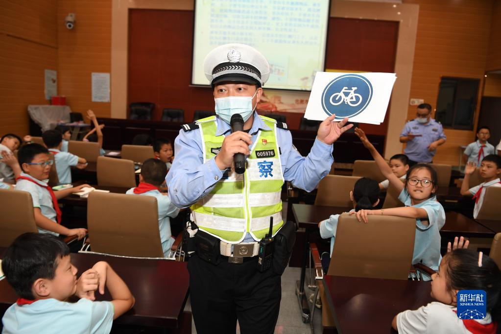 9月13日,合肥市公安局交警支隊(duì)包河大隊(duì)民警為孩子們講解交通安全標(biāo)識(shí)。