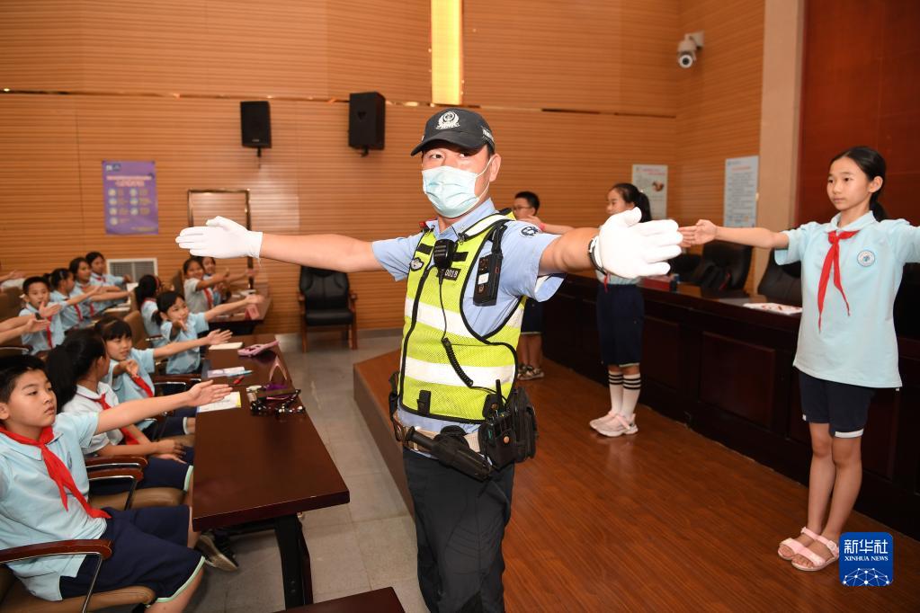 9月13日,合肥市公安局交警支隊包河大隊民警教學生們學習交警手勢。