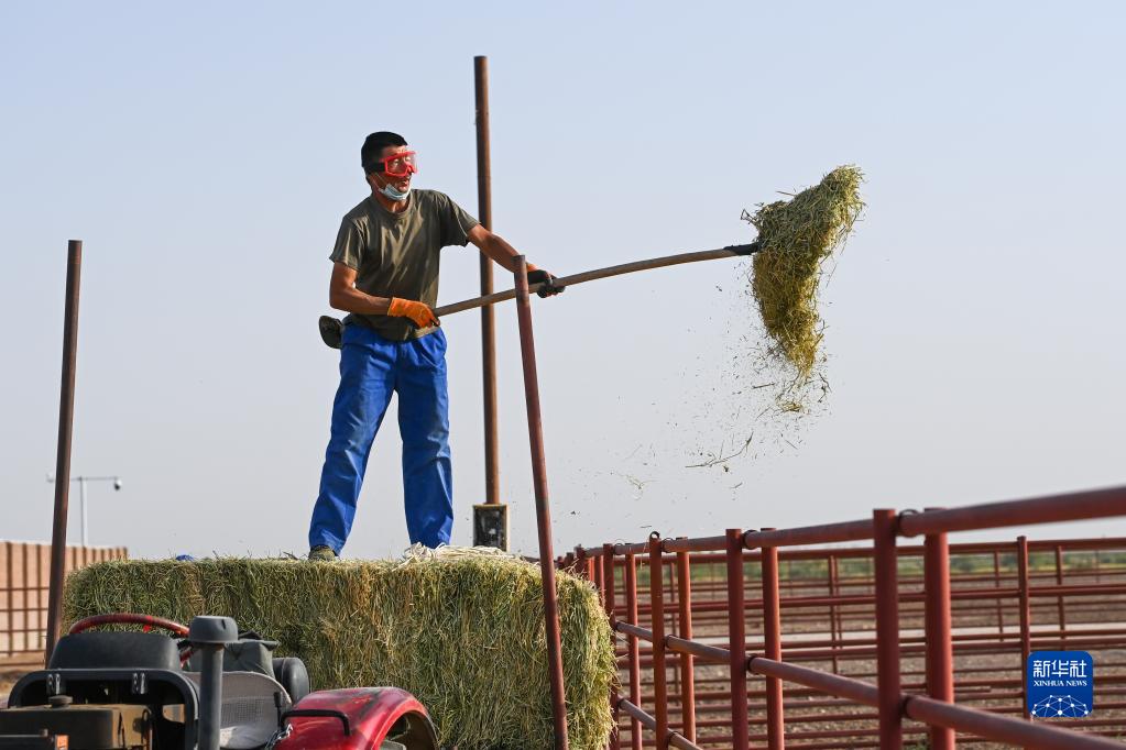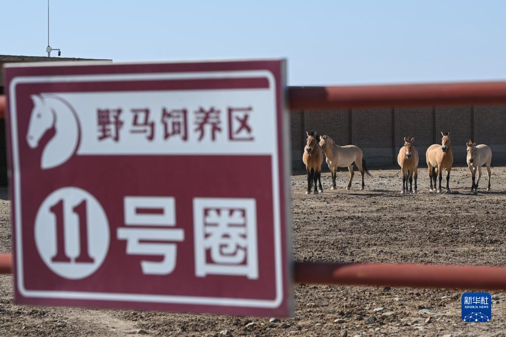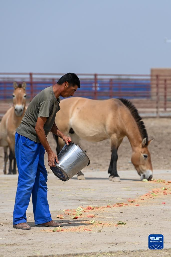 在新疆野馬繁殖研究中心,飼養員給野馬喂草(8月10日攝)。 新華社記者 丁磊 攝 |