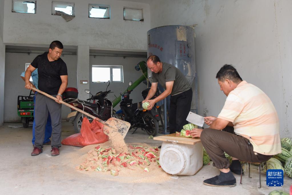 在新疆野馬繁殖研究中心,工作人員為野馬制作“西瓜解暑餐”(8月10日攝)。 新華社記者 丁磊 攝