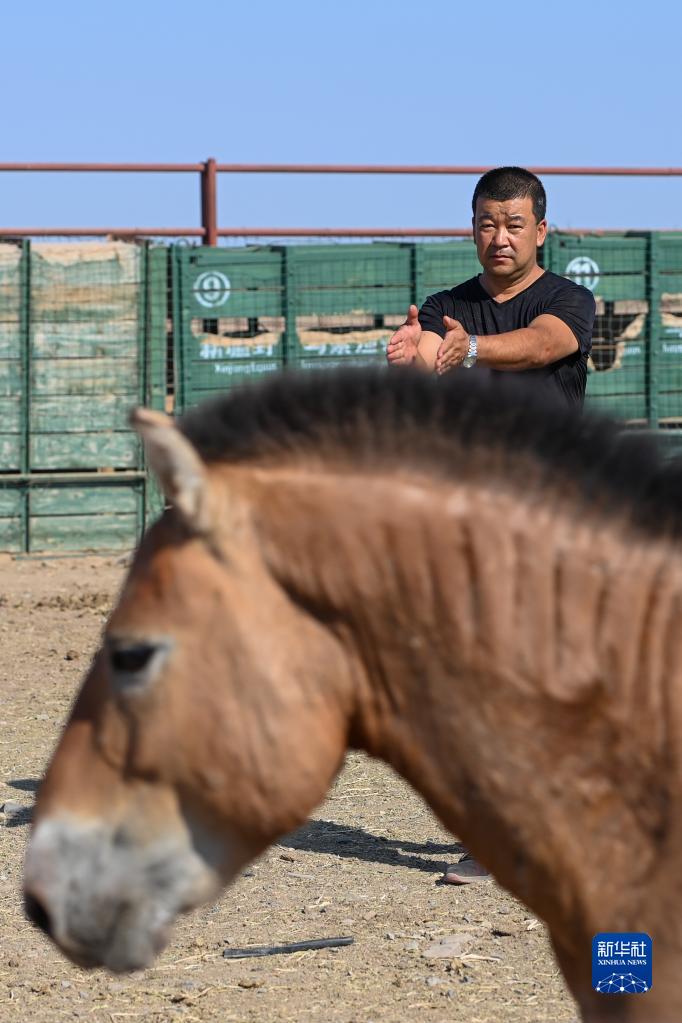 在新疆卡拉麥里山有蹄類野生動物自然保護區喬木西拜野放點,王振彪查看野馬身體狀況(9月1日攝)。 新華社記者 丁磊 攝