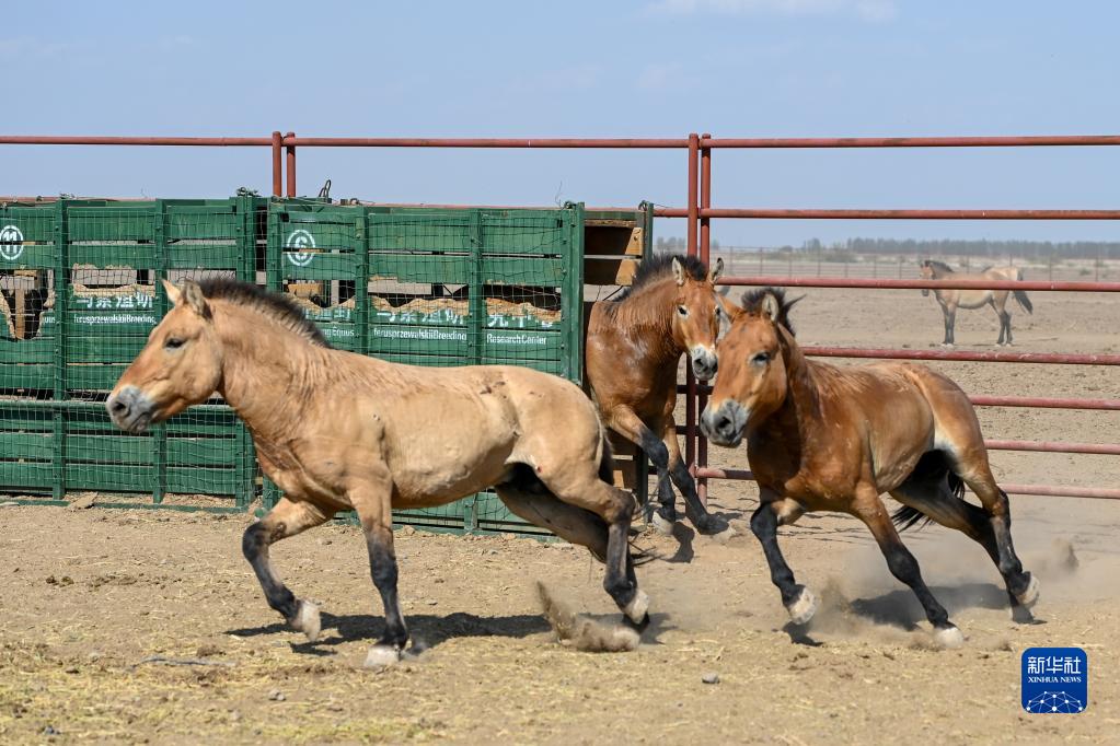 在新疆野馬繁殖研究中心,即將放歸野外的野馬進行適應運馬箱訓練(8月9日攝)。 新華社記者 丁磊 攝