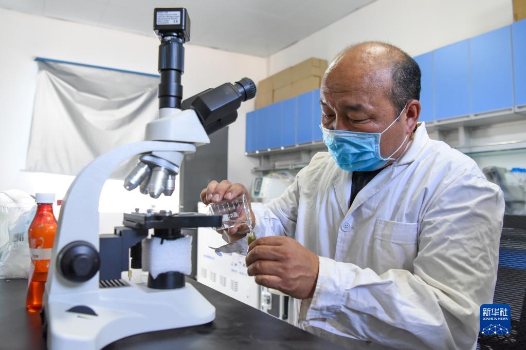在新疆野馬繁殖研究中心,獸醫師恩特馬克進行馬糞的寄生蟲檢查(2020年6月2日攝)。 新華社記者 丁磊 攝