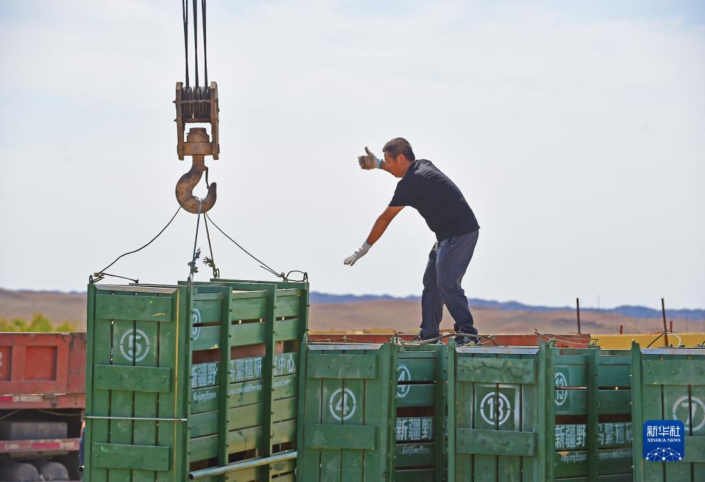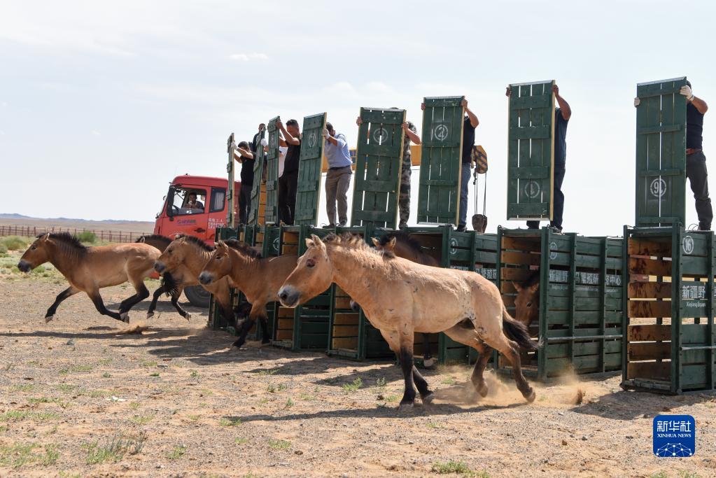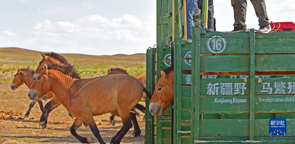 在新疆卡拉麥里山有蹄類野生動物自然保護區喬木西拜野放點,工作人員卸下運馬箱(9月1日攝)。 新華社記者 侯昭康 攝