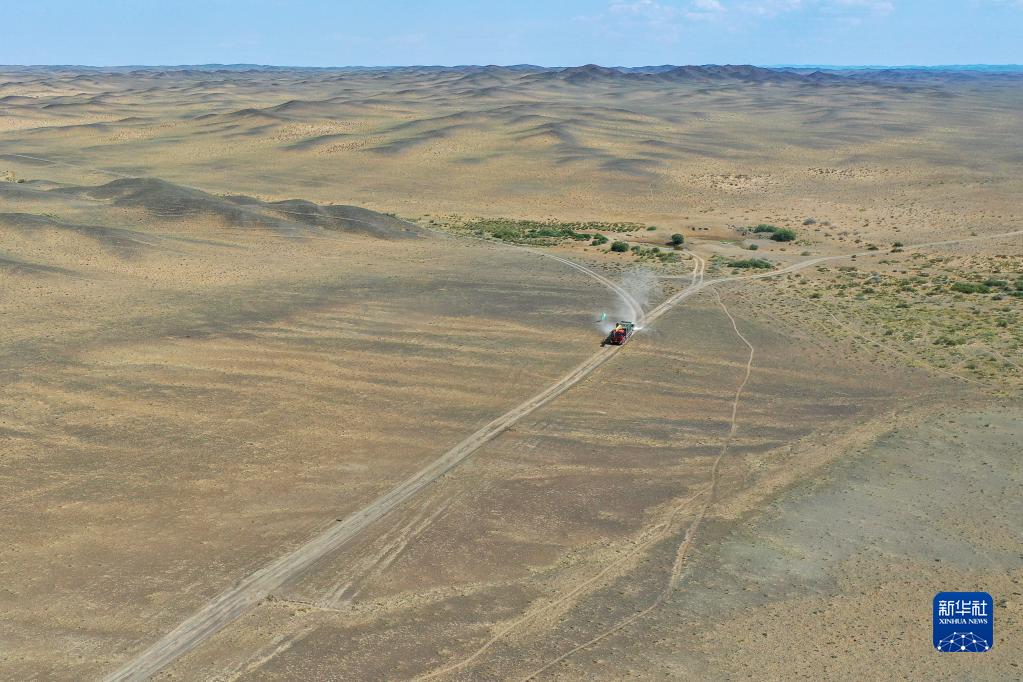 運載野馬的卡車進入新疆卡拉麥里山有蹄類野生動物自然保護區(9月1日攝,無人機照片)。 新華社記者 丁磊 攝