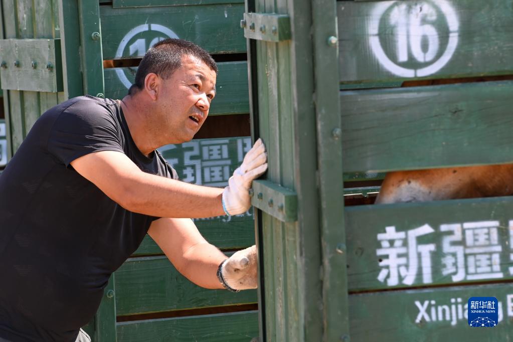在新疆野馬繁殖研究中心,王振彪對即將放歸野外的野馬進行適應運馬箱訓練(8月9日攝)。 新華社記者 丁磊 攝