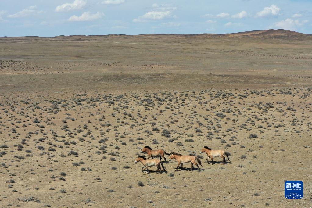 野馬在新疆卡拉麥里山有蹄類野生動物自然保護區漫步(2020年6月3日攝,無人機照片)。 新華社記者 丁磊 攝