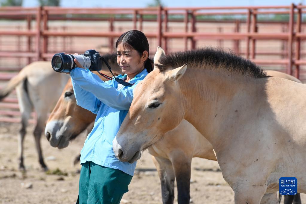 在新疆野馬繁殖研究中心,工程師張赫凡拍攝野馬照片素材(8月10日攝)。 新華社記者 丁磊 攝