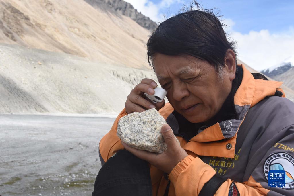 8月30日,在西藏日喀則市定日縣,中科院地理科學與資源研究所客座教授李渝生使用放大鏡觀察巖石。