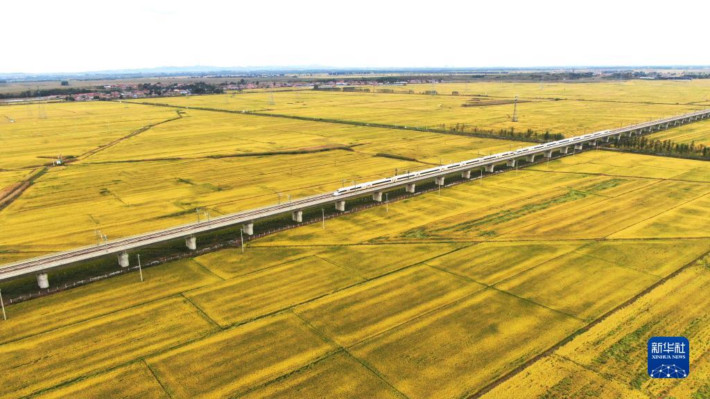 9月22日,在遼寧省鐵嶺縣腰堡鎮,高鐵列車從金色的稻田旁經過(無人機照片)。