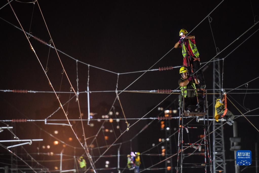 9月25日,施工人員在東莞塘廈贛深高鐵撥接廣深鐵路現場進行接觸網工程施工。
