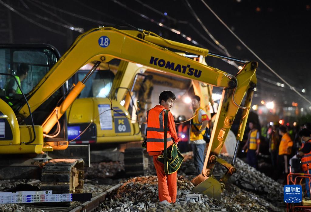 9月25日,一名施工人員在東莞塘廈贛深高鐵撥接廣深鐵路施工現場。
