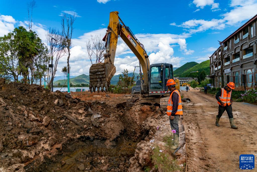 9月25日,工人在瀘沽湖畔的蒗放村湖濱濕地施工。 瀘沽湖位于川滇交界處,是川滇兩省共有的跨省湖泊,湖水水質穩定保持在國家Ⅰ類水標準。近年來,為保護好瀘沽湖生態環境,云南省麗江市寧蒗彝族自治縣大力實施80米生態紅線內民居客棧退出拆遷、湖濱生態帶建設、入湖河道治理等舉措,推動保護治理向好發展。 新華社記者 陳欣波 攝