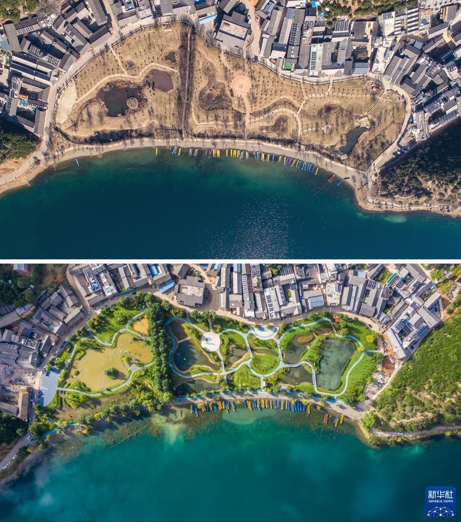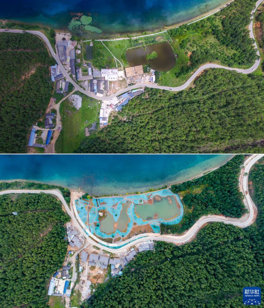 這是一張拼版照片,上圖為:寧蒗縣永寧鎮里格村湖濱生態帶建設及濕地修復項目(資料照片);下圖為:寧蒗縣永寧鎮里格村湖濱生態修復后的景象(無人機照片,2021年9月24日攝)。 瀘沽湖位于川滇交界處,是川滇兩省共有的跨省湖泊,湖水水質穩定保持在國家Ⅰ類水標準。近年來,為保護好瀘沽湖生態環境,云南省麗江市寧蒗彝族自治縣大力實施80米生態紅線內民居客棧退出拆遷、湖濱生態帶建設、入湖河道治理等舉措,推動保護治理向好發展。 新華社記者 胡超 攝