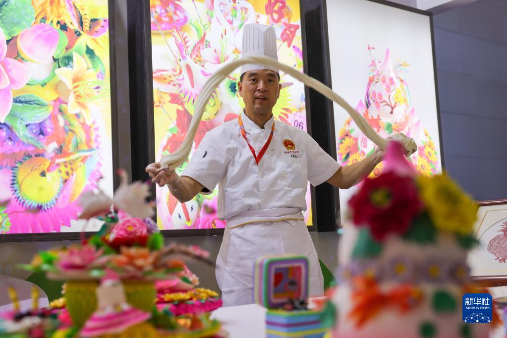 在“技能中國行2021——走進新疆”技能展示交流活動山東展示區,面點技藝傳承人在展示中式面點技藝(9月26日攝)。