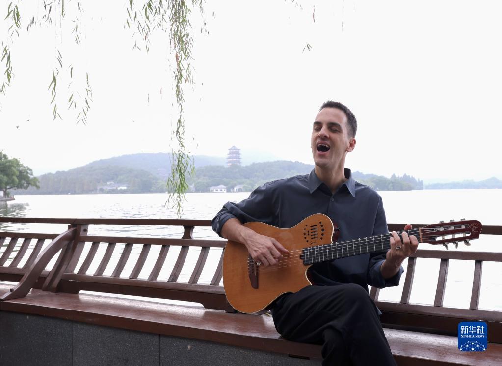 10月7日,格萊美獲獎者里卡多·福格特在西湖游覽時彈唱。