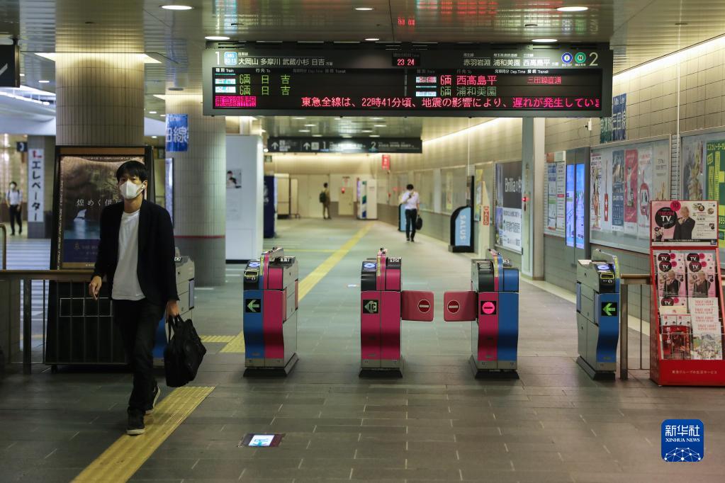 10月7日,在日本東京,一個車站的電子屏幕上顯示電車線路受地震影響延遲。新華社記者杜瀟逸攝