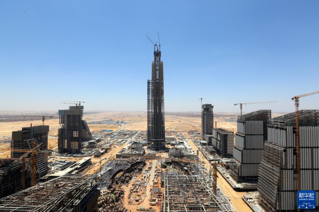 這是2021年6月17日拍攝的埃及新首都中央商務區標志塔(中)主體建筑封頂建設現場。