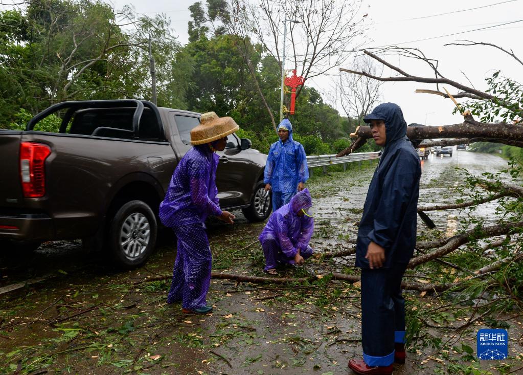 10月13日,在萬寧市山根鎮(zhèn),工作人員清理被臺風(fēng)刮倒的大樹。