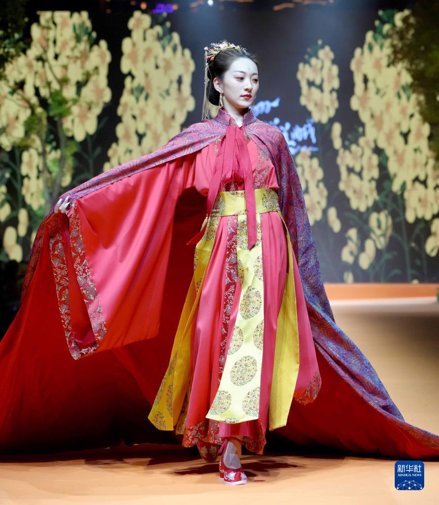 10月18日,模特在展示中國知名設計師、金頂獎獲得者張義超設計的時裝。 當日,2021中國重慶國際時尚周在重慶市渝北區T23時裝小鎮落下帷幕。在閉幕盛典上,中國金頂獎獲得者計文波、張義超和重慶籍時裝設計師以及重慶當地服裝品牌等聯合舉辦了一場主題為“紅星耀中國·時尚共攜行”的閉幕秀。新華社記者 陳建力 攝