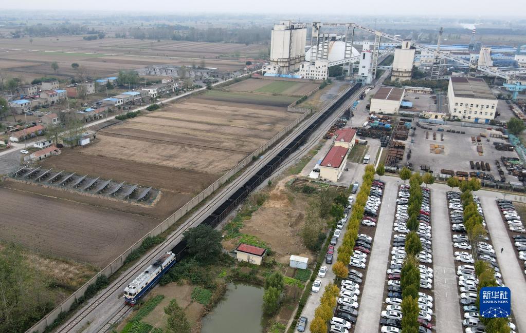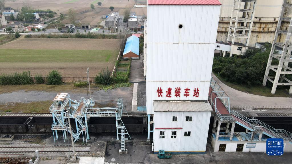 10月20日,在安徽省宿州市錢營孜煤礦,安徽鐵道發(fā)展集團公司電煤專列在裝運電煤(無人機照片)。新華社記者韓旭攝