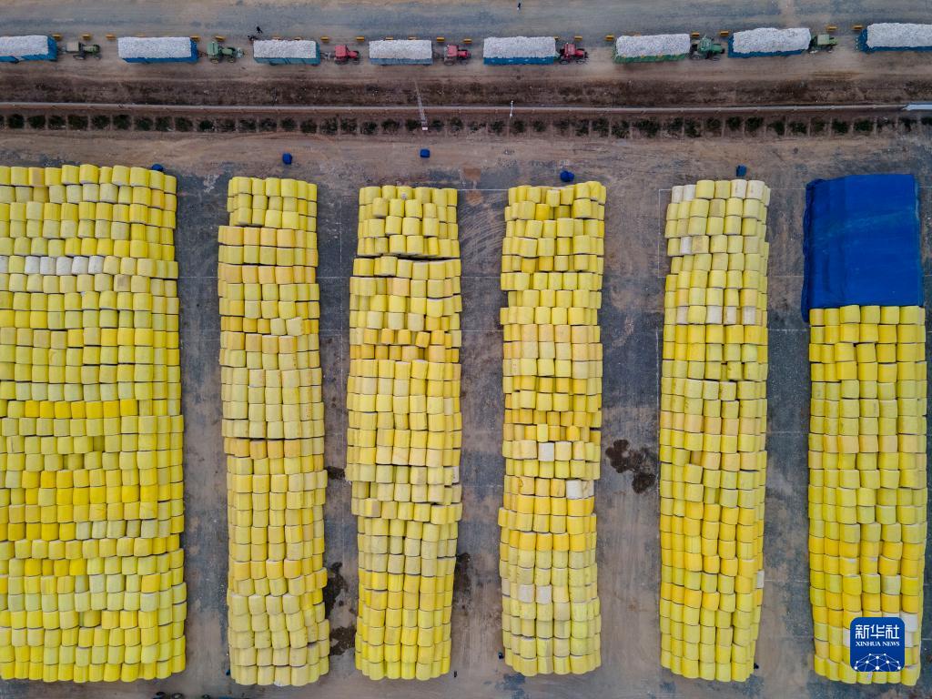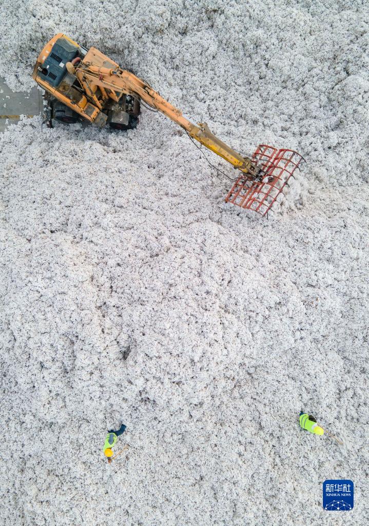 新疆沙灣市一家棉花收購廠的工人整理剛收購的新棉(10月20日攝,無人機照片)。新華社記者 胡虎虎 攝