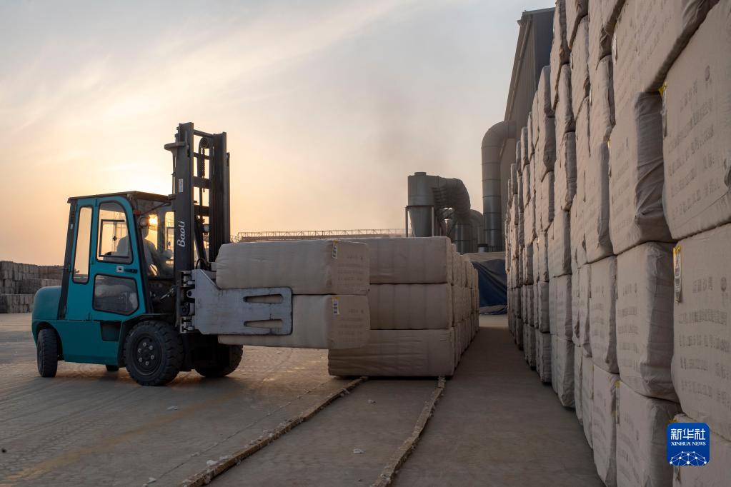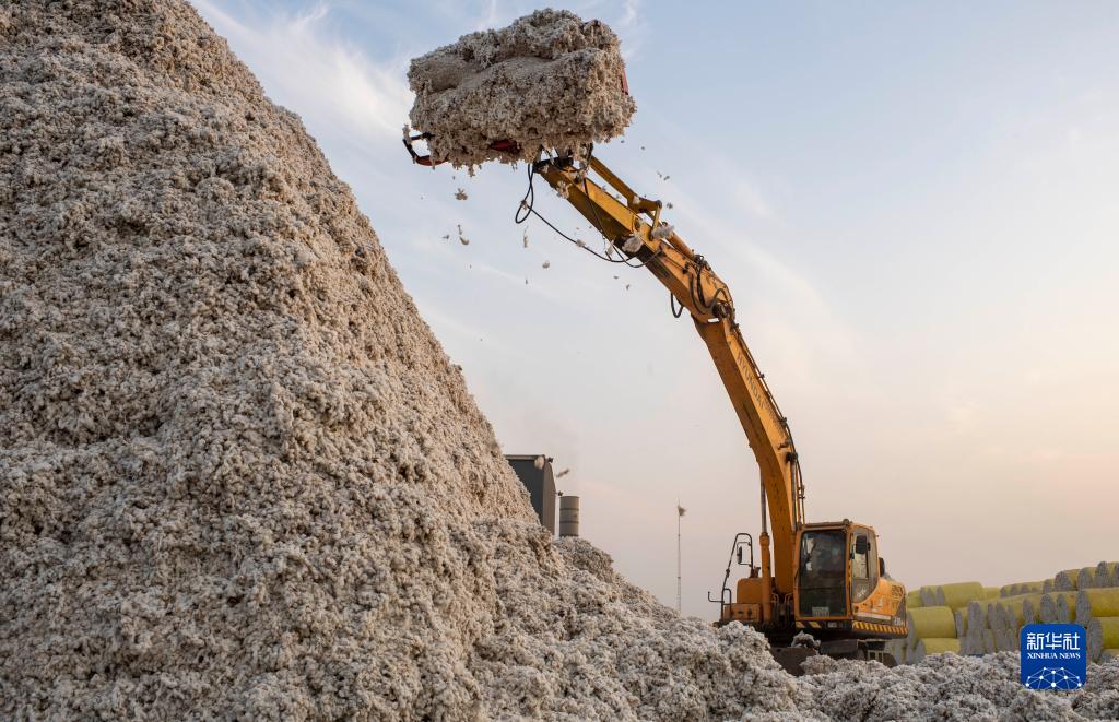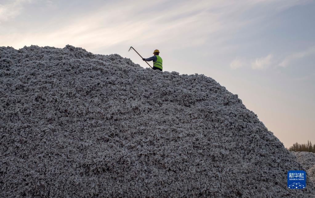 在新疆沙灣市的一家棉花收購廠,工人把剛收購的新棉堆垛(10月20日攝)。新華社記者 胡虎虎 攝